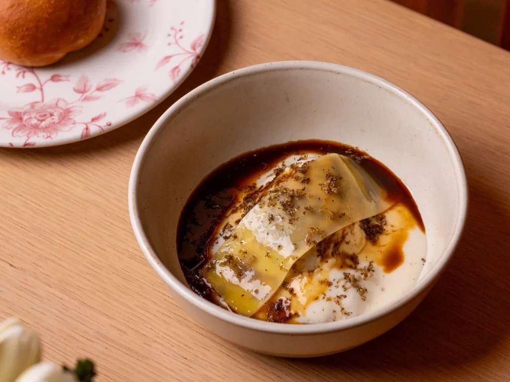 El menú continúa con Texturas y colores, una composición de tubérculos y cítricos que representa la belleza cromática del otoño; y con Del gallinero al plato, un huevo fresco del día que recuerda al clásico canelón con pasta fresca, carne de asado, nuez moscada y trufa.