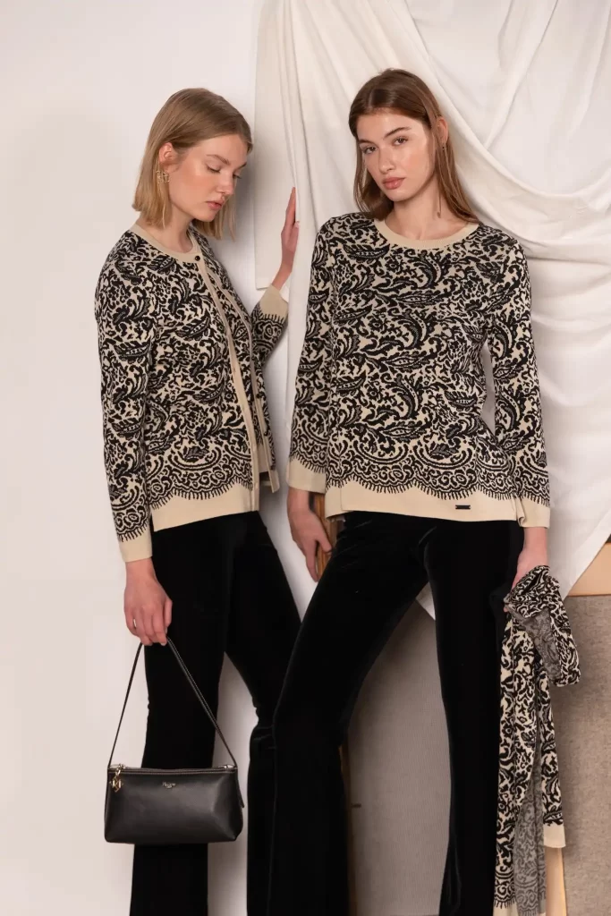 El punto vuelve a ser protagonista, reinterpretado en jacquards artesanales, texturas geométricas y estampados florales y animales que dialogan con naturalidad. Destaca un diseño que recuerda al encaje en negro y beige, elegante y sutil, que condensa el espíritu de la temporada: la belleza del detalle.