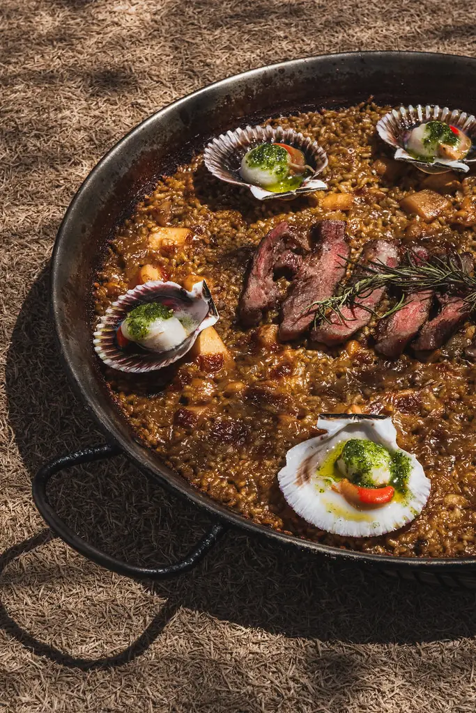 Los fines de semana y festivos, la experiencia se eleva a su máximo esplendor: calçots ilimitados con romesco casero, pan con alioli y tomate, y alcachofas frescas del Parc Agrari que reflejan el compromiso del restaurante con la proximidad. El comensal puede elegir entre la icónica Parrillada Mamut, con pluma ibérica y una selección de carnes acompañadas de judías de Santa Pau, o un exquisito arroz mar y montaña elaborado con pluma ibérica y zamburiñas. Una propuesta completa con postre y bebida, que invita a saborear el invierno en compañía.