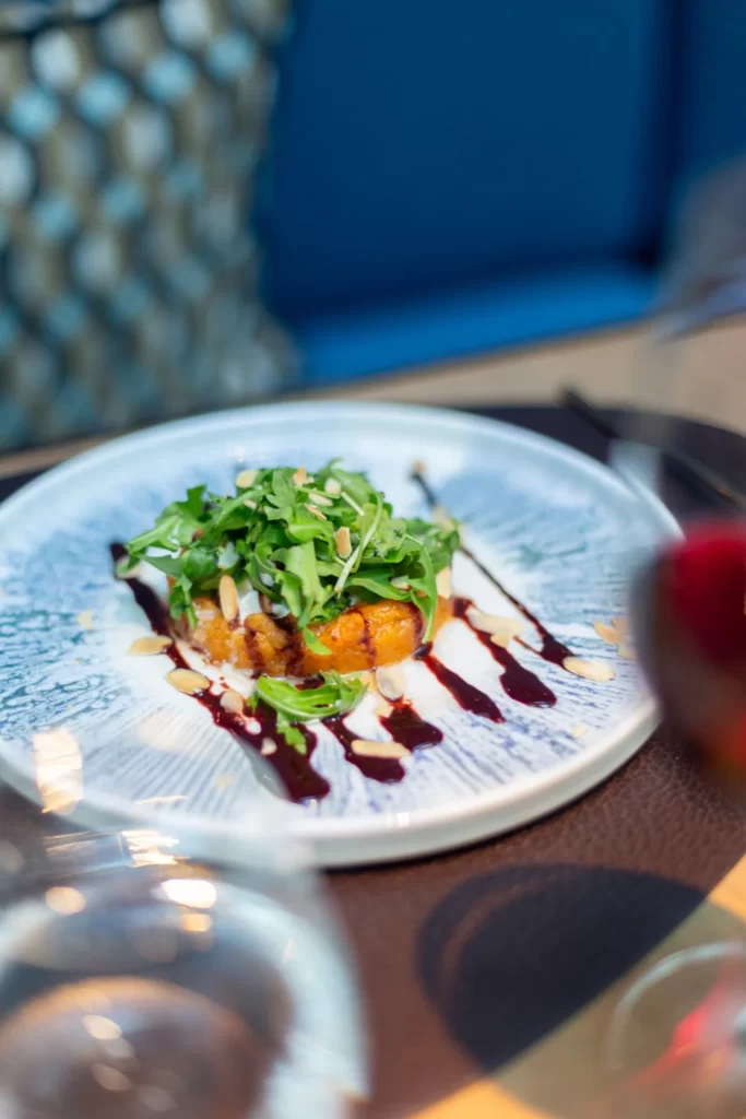 Entrantes que juegan con contrastes y texturas —como el carpaccio de pulpo con espuma de patata y aceite de pimentón o la delicada crema de coliflor cítrica con vieiras— dan paso a principales que reinterpretan la tradición desde una mirada actual. Desde carnes con carácter hasta opciones vegetales sofisticadas, cada elaboración mantiene un hilo conductor claro: el respeto absoluto por el producto.
