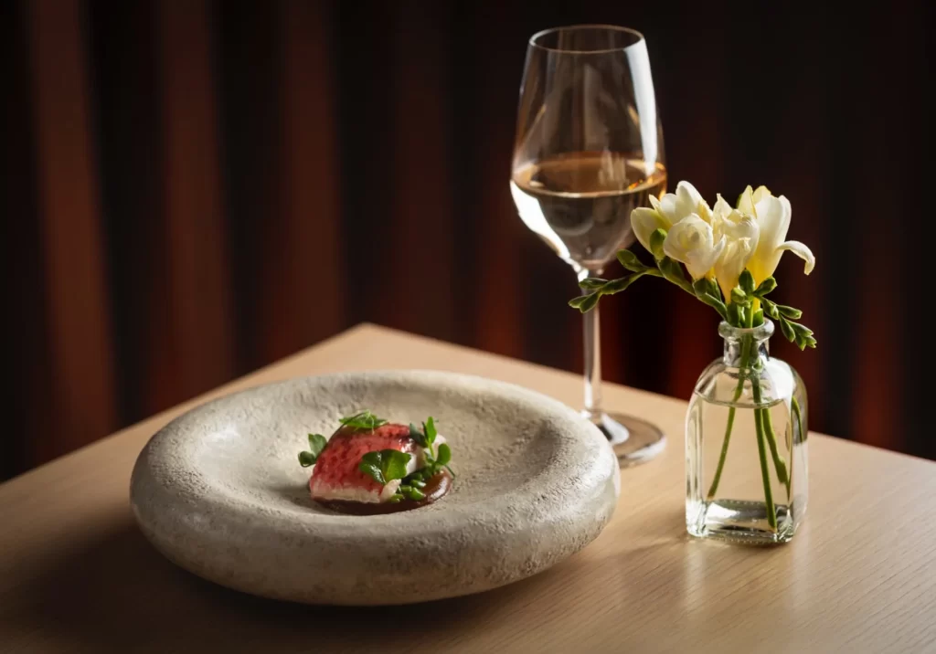 Esta nueva colaboración se materializa en un menú degustación de cinco pasos concebido como un itinerario por la trayectoria profesional del chef. Cada plato incorpora el año de su creación, un gesto que añade profundidad al relato y convierte la degustación en una suerte de biografía culinaria en movimiento. Más que una sucesión de recetas, el menú funciona como una cartografía creativa de su evolución, abierta además a pequeñas variaciones según el producto y el momento.