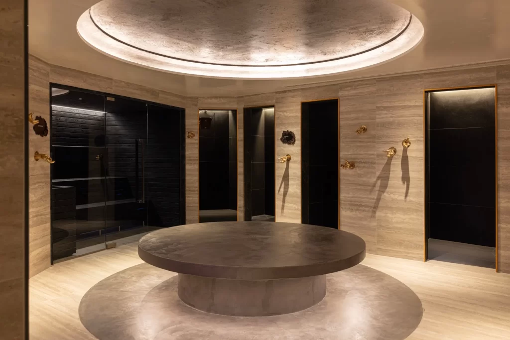 En el corazón del spa, una plataforma circular de mármol ordena el recorrido bajo una iluminación tenue y envolvente, mientras una espectacular piscina inspirada en un cenote, con efecto lluvia y fondo digital, convierte el espacio en una escapada casi onírica. El resultado es una atmósfera donde cada detalle ha sido concebido para provocar una sensación de desconexión sofisticada, sin perder el pulso sofisticado que define el universo SLS.