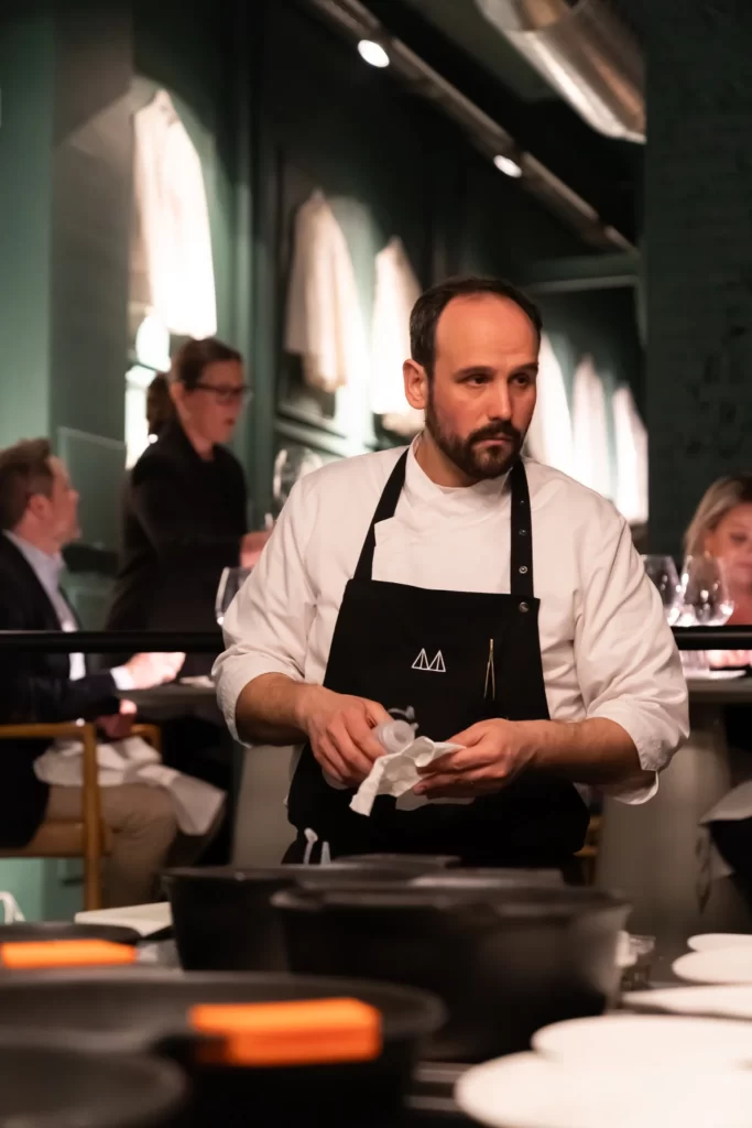 A partir de ahí, el menú desplegó una secuencia de platos que confirmó el potencial gastronómico de la huerta navarra cuando dialoga con miradas culinarias diversas. Roberto Ruiz, desde Jaiba, aportó una lectura vibrante y personal con su ‘Ceviche de tomates y sardina’ y su ‘Taco de berenjenas’. Fran Agudo, al frente de MontBar, firmó dos elaboraciones de gran precisión: ‘Espárrago blanco, escabeche de ostra y mignonette’ y ‘Guisantes, pistacho y ficoide glacial’. Virgilio Martínez presentó ‘Borraja, arroz y berberechos’ y un delicado prepostre de ‘Cebolla y cerezas’, mientras Luis Salcedo, desde Remigio, completó la experiencia con ‘Alcachofa, pistacho y estragón’ y un cierre dulce tan inesperado como elegante: ‘Coliflor y champiñón’.